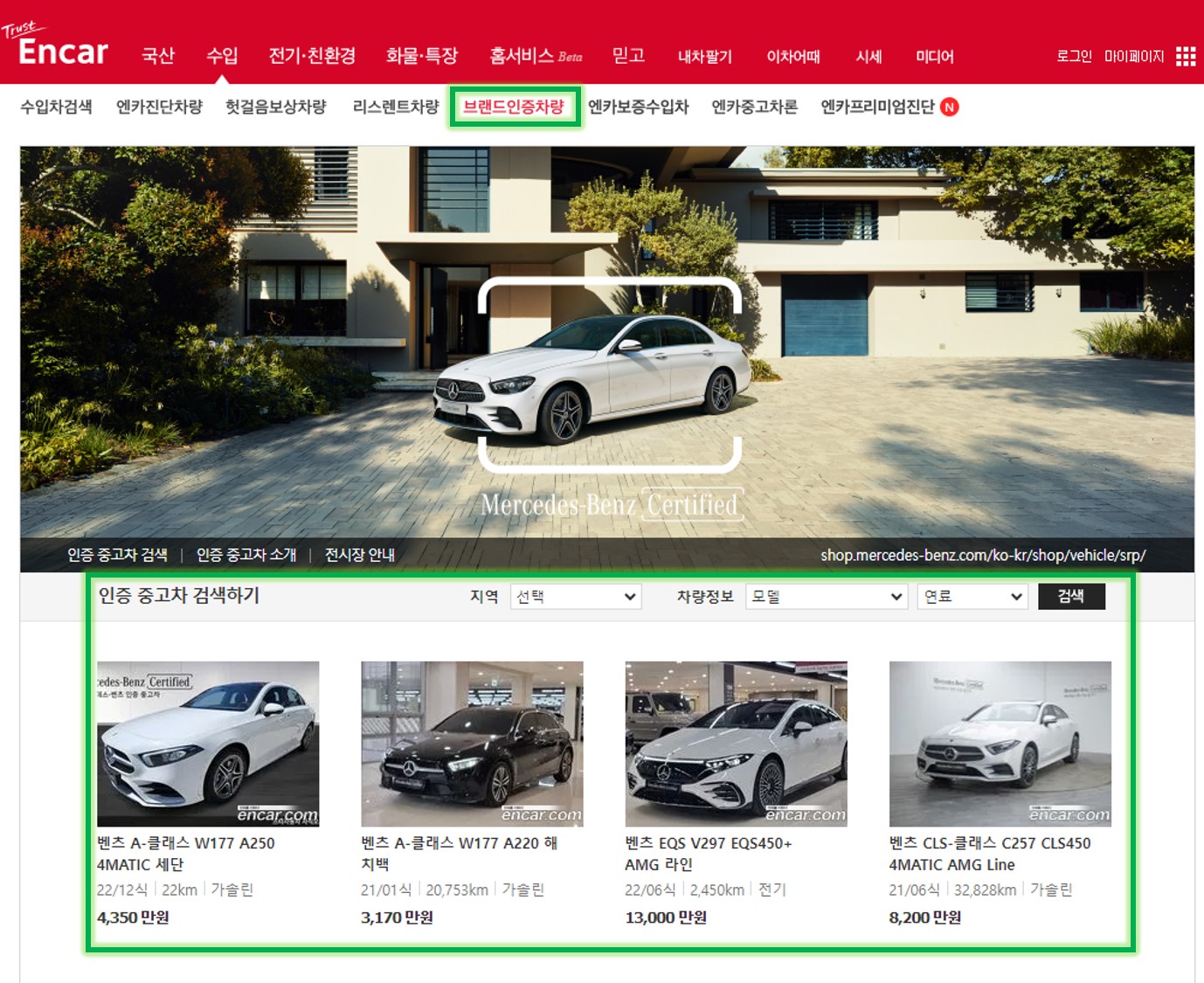 대한민국 대표 중고차 온라인 플랫폼인 엔카에서 벤츠 인증중고차 매물들을 쉽게 서칭 할 수 있습니다. 전국의 11개 벤츠 딜러사들에서 운영하는 인증중고차 매물들을 쉽게 서칭 할 수 있는 곳입니다.