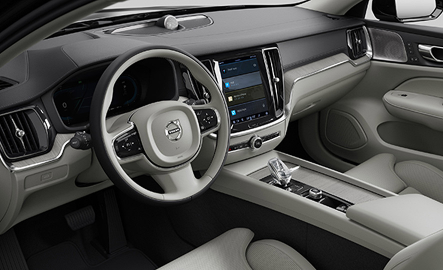 볼보 S60 다크 에디션의 내부 디자인은 천연 나무의 질감이 느껴지는 드리프트 우드와 스웨덴 오레포스 크리스탈 기어노브가 조화를 이룬 블론드 나파 가죽으로 구성되어 있습니다.