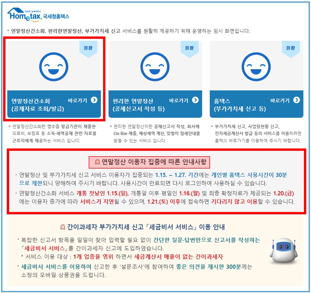 국세청 홈택스에 접속 하시면 현재 연말정산 시즌으로 바로