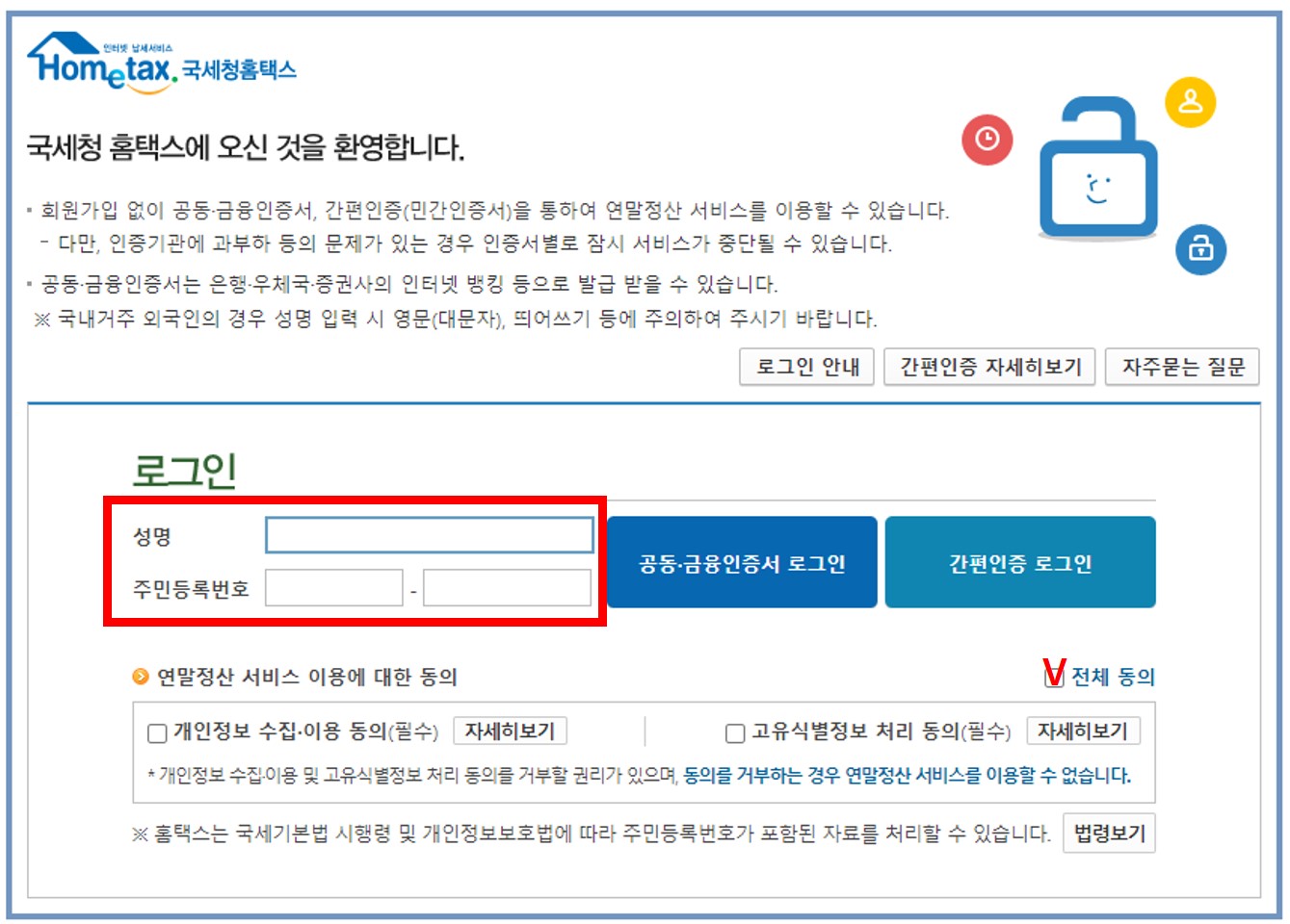그 다음 연말정산 서비스 이용대 대한 동의 부분은 모두 필수사항 이므로